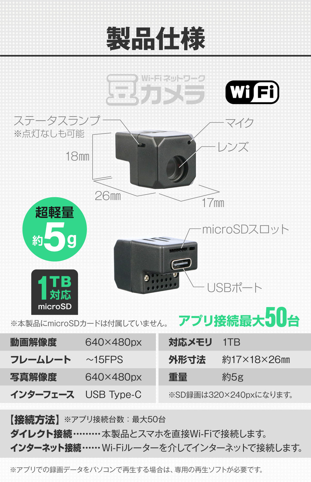 指先サイズの超極小「豆カメラ」!小さくてもネットワーク接続に対応!外出先からでもWi-Fi接続でネットワーク越しにモニタリングできる!便利なスマホアプリで最大50台までのカメラ接続して一括管理!スマホの1画面に4台までのカメラ映像を同時に表示可能!